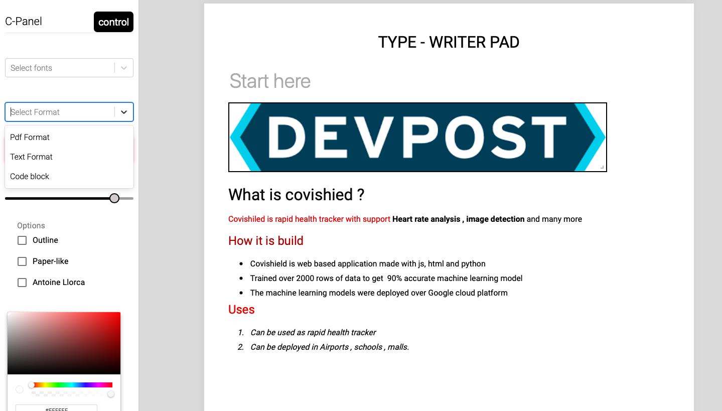 Type-writer is a documenting web application with the support of many modern techniques to make documenting easier and faster. The web application itself contains clean and interactive UI making it easier to navigate. Some of the most promising features include markdown editing, copy pasting of images and resizing, mathematical equation formatting, syntax highlighter for code blocks etc. The application also contains user authentication through login/sign-up feature. Type-writer is also well equipped with version control to keep a track record for all saved versions of a file in the cloud. Users are also given choices in 3 different formats to download their files in local environment (i.e PDF format, text format, code block format).