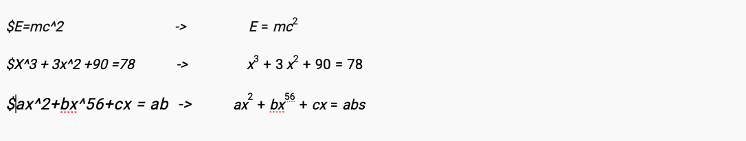The equation formatting features supports all Algebric, triagnometric and Matrices formatting, following with prefix " $ ".