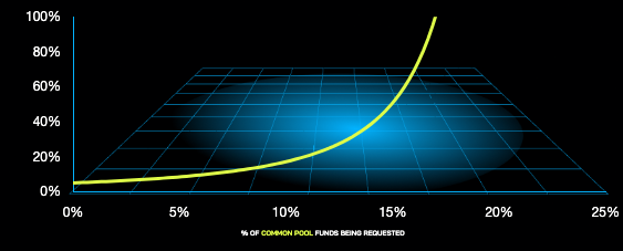 This shows how the minimum percent of tokens needed to pass proposals after 2 weeks varies with the percent of the Common Pool funds being requested.