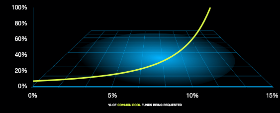 This shows how the minimum percent of tokens needed to pass proposals after 2 weeks varies with the percent of the Common Pool funds being requested.