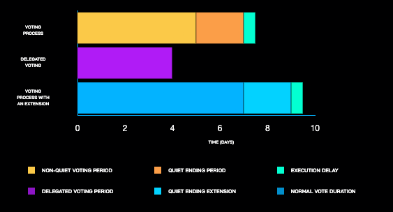 - Quiet Ending Period: 2 day(s), this means that 2 day(s) before the end of the Vote Duration, if the vote outcome changes, the Quiet Ending Extension will be triggered.