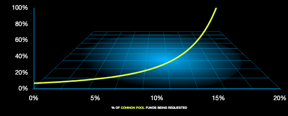 This shows how the minimum percent of tokens needed to pass proposals after 2 weeks varies with the percent of the Common Pool funds being requested.