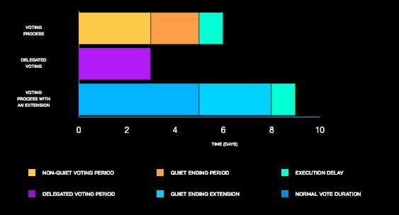 - Quiet Ending Period: 2 day(s), this means that 2 day(s) before the end of the Vote Duration, if the vote outcome changes, the Quiet Ending Extension will be triggered.