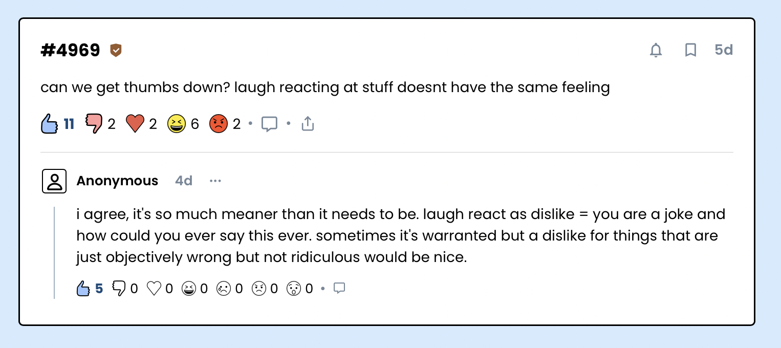 The post that introduced the idea of a thumbs down reaction did get a lot of support however, so we will continue thinking about this internally. Would love to hear your thoughts.