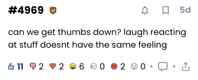 On a more meta level, I personally wonder if having a thumbs down reaction would make Dear Blueno a more argumentative space, where content is viewed more so as whether it is "correct" or "incorrect." From a user perspective, it feels better for your comment to get no reactions than a bunch of thumbs down.