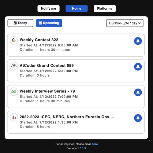 ⚙️ This extension shows contest details of upcoming contests on 8 different platforms. Those platforms are: