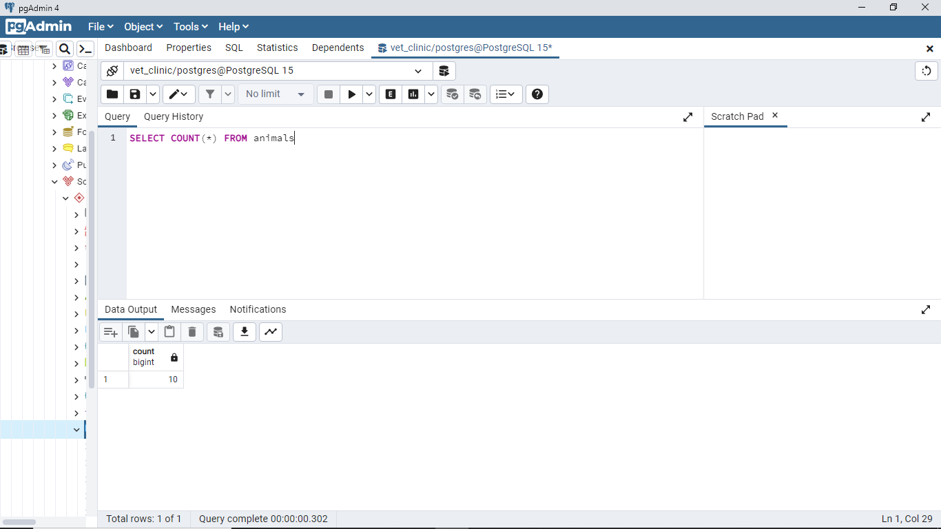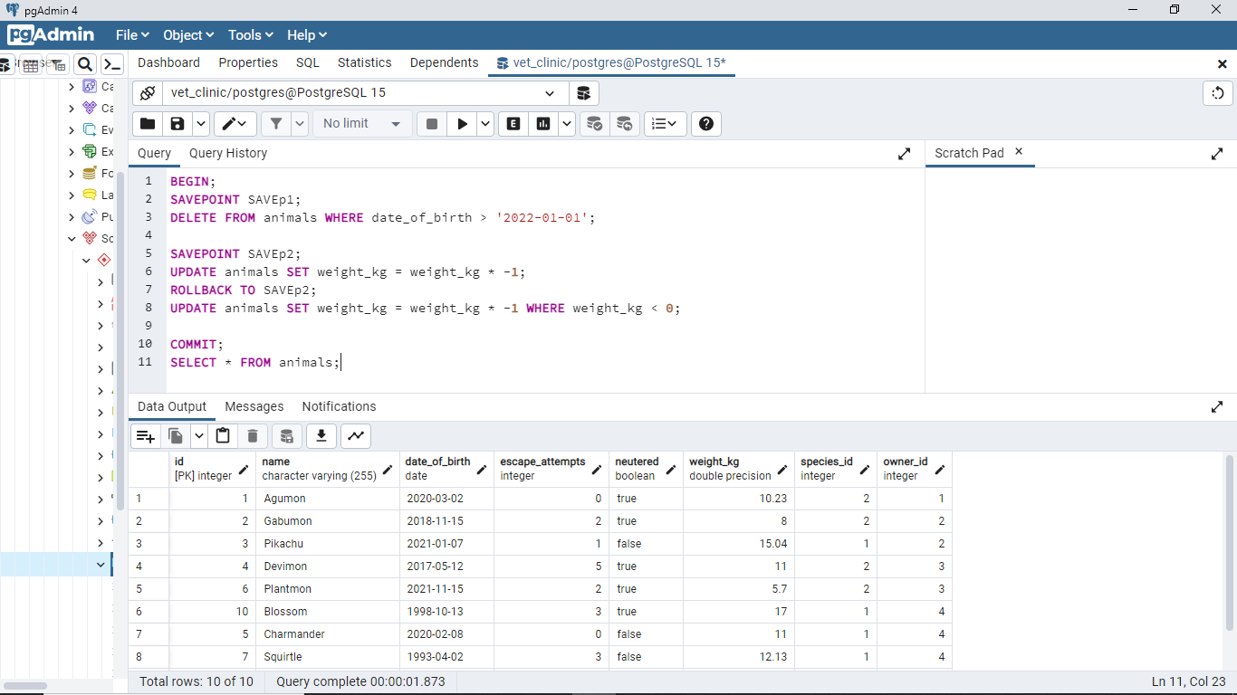 10and not11. By the time you update the transactions that should delete all animals born after 01/01/2022, you would have10as the total number of animals. Kindly update the screenshot for this query after the transaction. 👍 💻