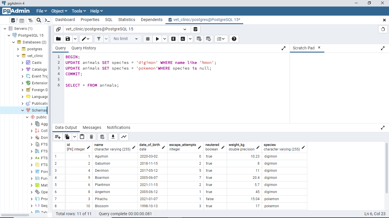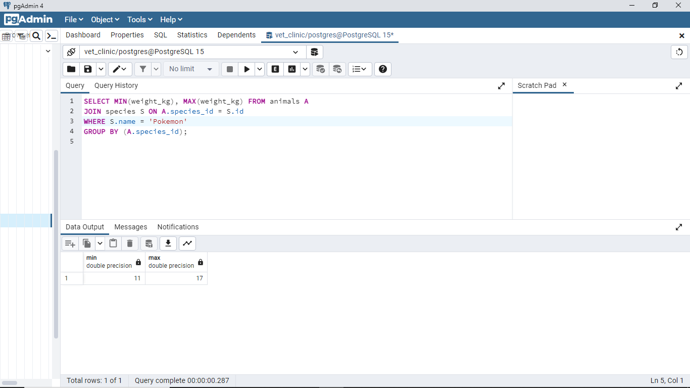 17and not22. By the time you update the transactions that should delete all animals born after 01/01/2022, you would have17as the maximum weight of pokemon animals. Kindly update the screenshot for this query after the transaction. 👍 💻
