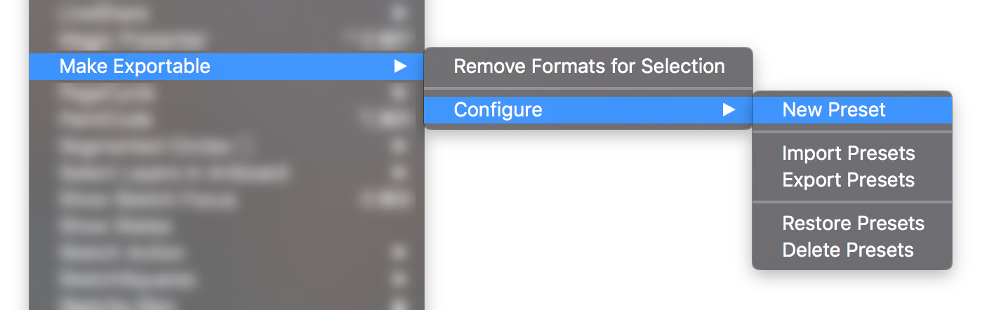 With the same layer selected, run the Make Exportable > Configure > New Preset plugin command.