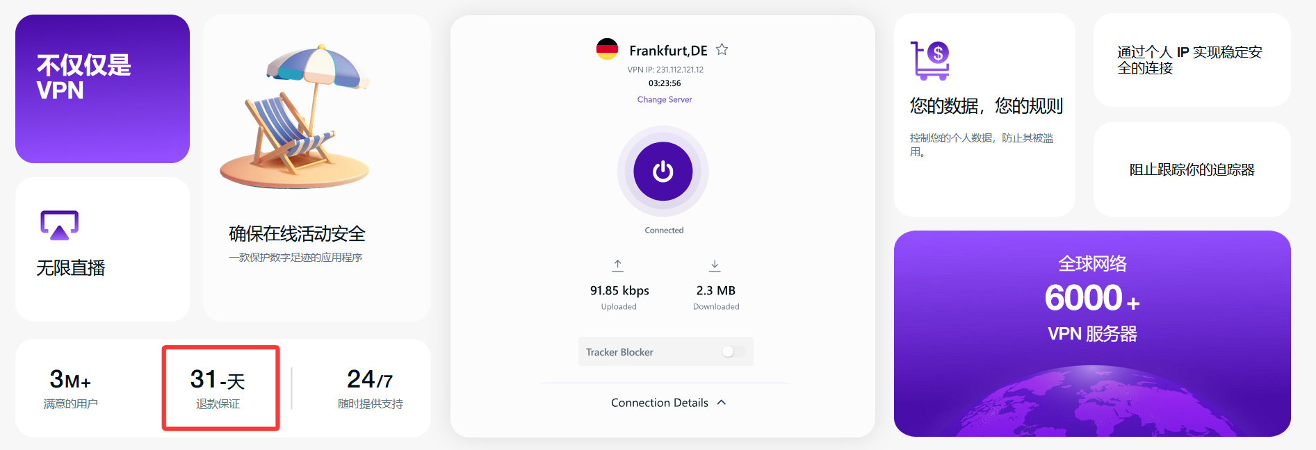 作为一家2007年就成立的老牌服务商,PureVPN在全球拥有超过300万的庞大用户群。它在圈内一直被大家称为“价格屠夫”,主打超高的性价比。对于想零成本体验高端翻墙服务的朋友来说,PureVPN提供了31天无理由退款保证,比同行多出整整一天的试用期,你完全可以利用这项政策,把它当成一款免费的高级VPN使用整整一个月。