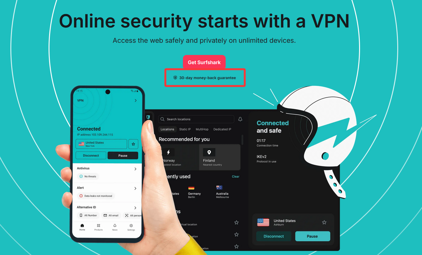 Surfshark是近年来VPN市场中备受瞩目的一匹黑马。它最吸引人的核心卖点是支持“无限设备同时连接”。这意味着你只需注册一个账号,就能让家里的手机、电脑、平板甚至智能电视同时实现科学上网,非常适合多设备党或与亲友共享使用。对于想零成本体验顶级网络服务的朋友,Surfshark明确承诺提供30天无理由退款保证。你完全可以利用这项政策,把它当成一款没有任何限制的高级免费工具,安心试用整整一个月。