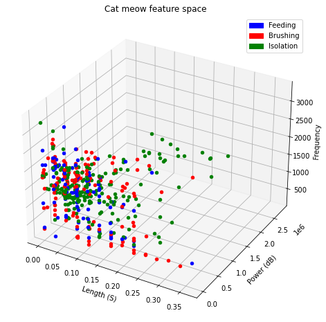 Plotting our features showed no clear patterns, except perhaps that cats sometimes meow louder when isolated. Many of the audio files were poorly captured and did not display clear harmonics as they should. All cats have different psychologies and can have similar meows in different situations, so a different approach may be able to tackle this problem.