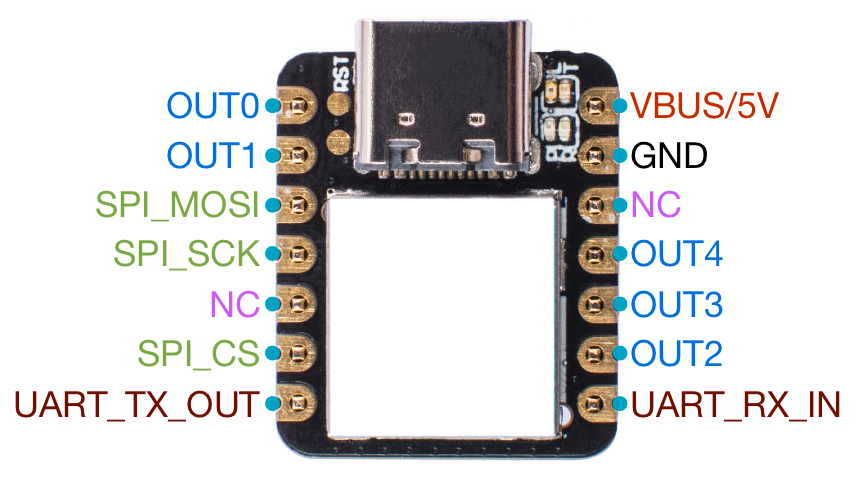| 0x08 | GPO | 1 bit per output, 5 outputs | X | X | X | OUT4 | OUT3 | OUT2 | OUT1 | OUT0 |