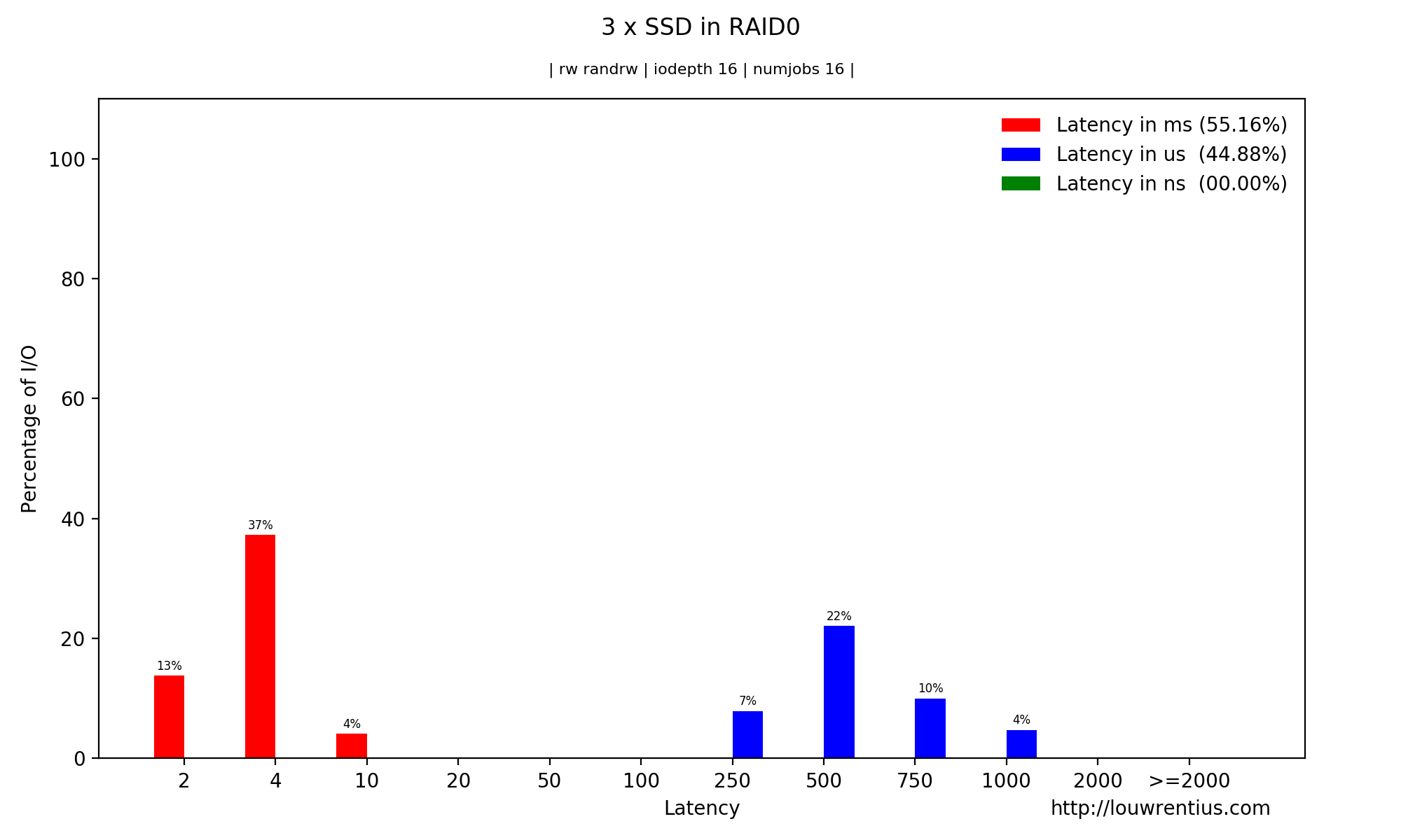 The FIO JSON output also contains latency histogram data. It's available in a ns, us and ms scale.