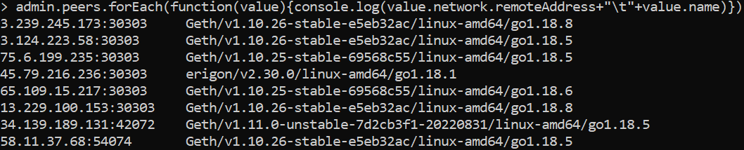 admin.peers.forEach(function(value){console.log(value.network.remoteAddress+"\t"+value.name)})