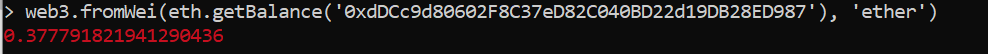 web3.fromWei(eth.getBalance('0xdDCc9d80602F8C37eD82C040BD22d19DB28ED987'), 'ether')