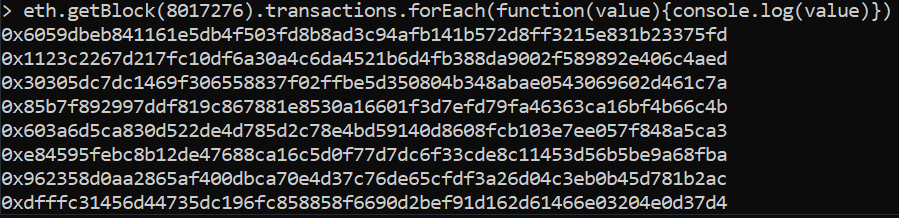 eth.getBlock(8017276).transactions.forEach(function(value){console.log(value)})