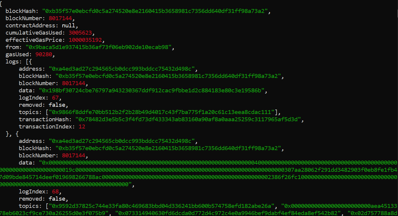 eth.getTransactionReceipt("0x78482d3e5b5c3f4fd73df433343ab83160a90af8a0aaa25259c3117965af5d3d")