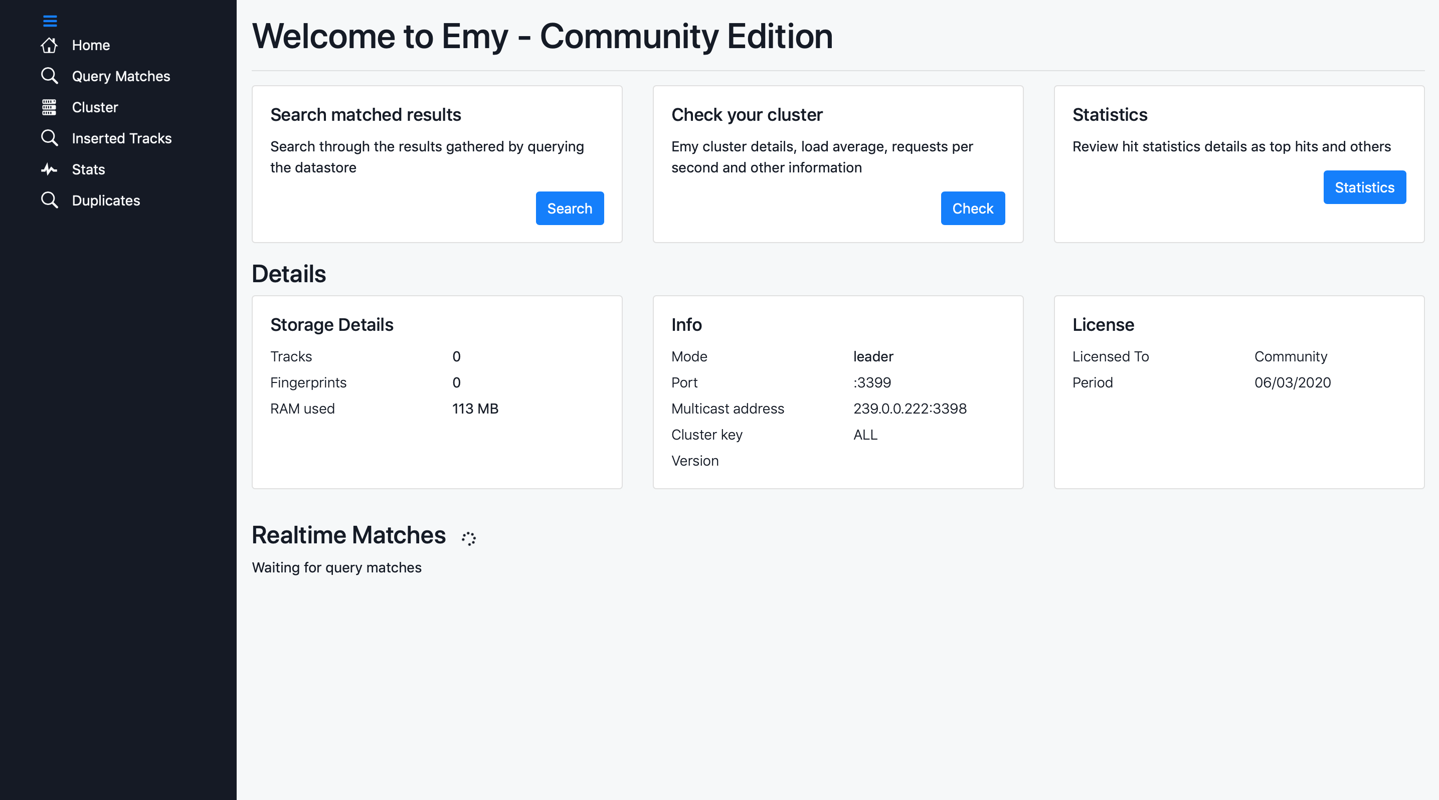 Emy provides a backoffice interface which you can access on port :3340. In order to insert and query Emy server please install SoundFingerprinting.Emy NuGet package.
