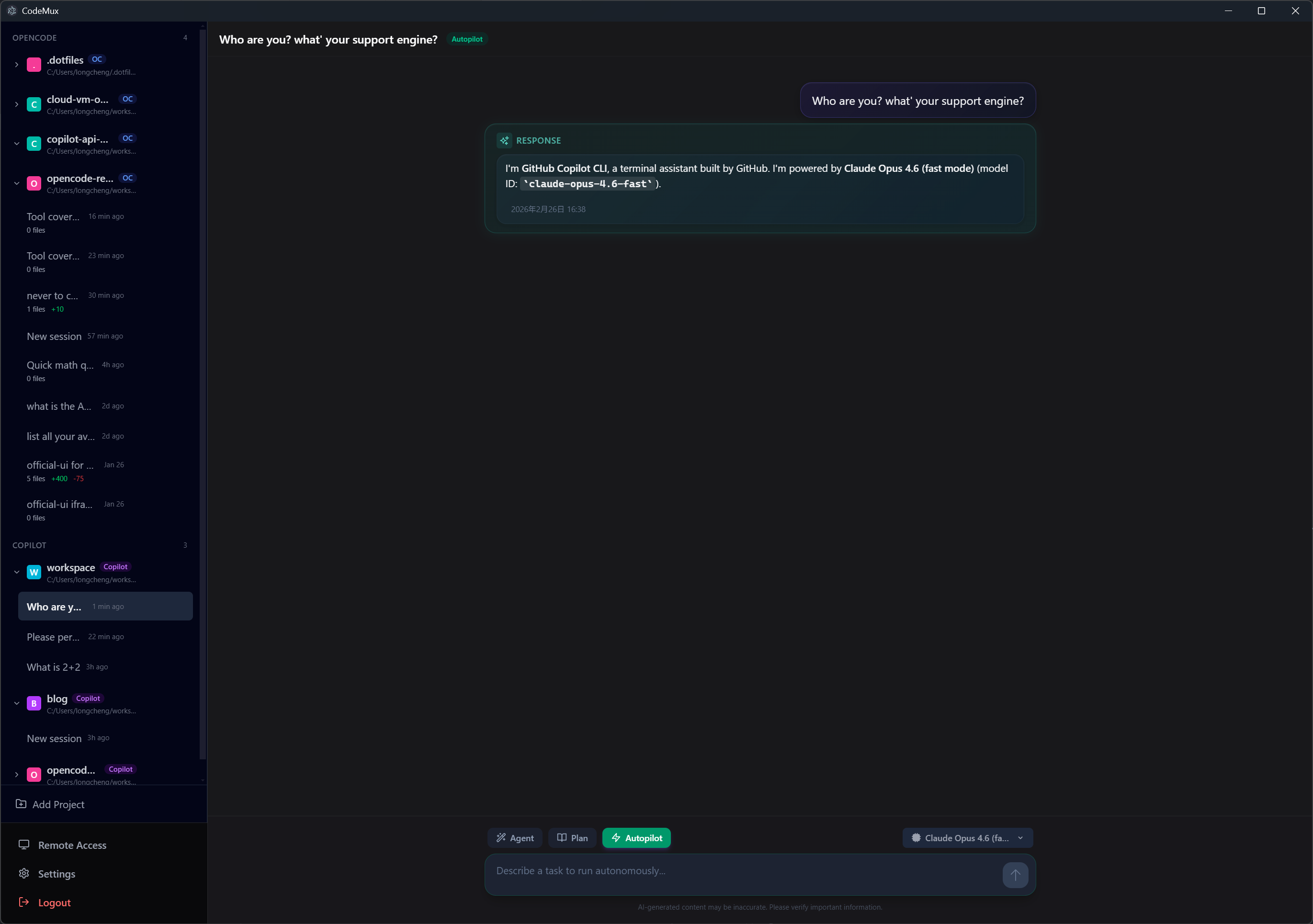 - Agent mode switching: Toggle between Build / Plan / Autopilot modes per engine — each with its own behavior and prompt style